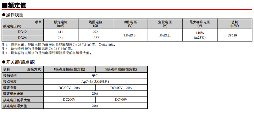 通過產品的2接點串聯實現了DC400V 20A雙向開閉 寬度15.2mm的纖細尺寸實現了無論極性的DC200V 20A開閉 功耗530mW的高靈敏度 (保持電壓50%的使用環境下實現更好的節能效果) 線圈和接點間的絕緣距離5.5mm以上,耐沖擊電壓10kV的高絕緣性 串聯連接取得了UL/TüV/CQC認證