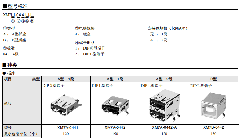 符合USB標準的 小型接口連接器 符合USB2.0標準。 插拔次數可達1,500次。 A型插座封裝在計算機主體、USB集線器等上,B型插座封裝在調制解調器、掃描儀、鼠標等計算機外圍設備上。 有無認證規格,請參見“規格認證”。